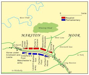Οι τελευταίοι ελίχθηκαν για να τον αντιμετωπίσουν σε ένα βάλτο έξω από την πόλη, τον Marston Moor, έχοντας εμπιστοσύνη στους ανώτερους αριθμούς τους. Η μάχη διεξήχθη αργά το απόγευμα: οι δυνάμεις των βασιλοφρόνων δεν κατόρθωσαν να συγκεντρώσουν όλη τη δύναμή τους από αντιπάθειες προς τον υπερφίαλο Ρούπερτ και από διαμαρτυρίες των στρατιωτών για τους μη καταβληθέντες μισθούς. Οι Κοινοβουλευτικοί μπόρεσαν να συγκεντρώσουν αρκετούς από τους Πρεσβυτεριανούς Σκωτσέζους και να πυκνώσουν τις τάξεις τους αλλά χωρίς να έχουν συνοχή.