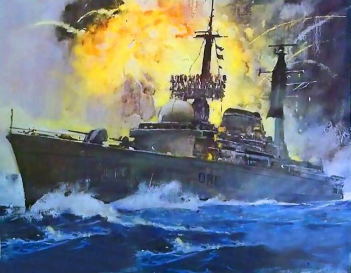 Οι πύραυλοι κατευθύνθηκαν προς το αντιτορπιλικό, που δεν έδειξε σημεία συναγερμού. Ένας από αυτούς κατέπεσε στη θάλασσα μισό μίλι πριν το πλοίο αλλά ο άλλος το χτύπησε στο μέσον, 2,5 μέτρα περίπου πάνω από την ίσαλο γραμμή. Από το χτύπημα ξέσπασε πυρκαγιά που γέμισε γρήγορα το πλοίο με καπνούς, προκαλώντας φοβερά εγκαύματα σε πολλούς ναύτες.