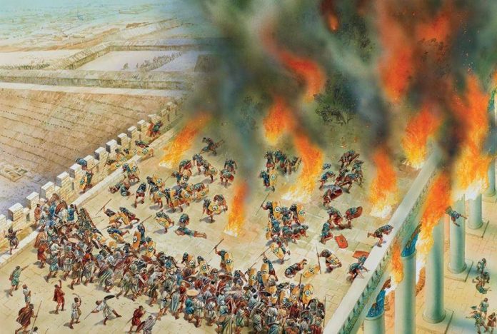 Τα ρωμαϊκά στρατεύματα του στρατηγού Τίτου κατορθώνουν να διασπάσουν τα τείχη της Ιερουσαλήμ, περιορίζοντας τους επαναστατημένους Ζηλωτές στο Ναό “του Σολομώντα” και την Άνω και Κάτω πόλη.